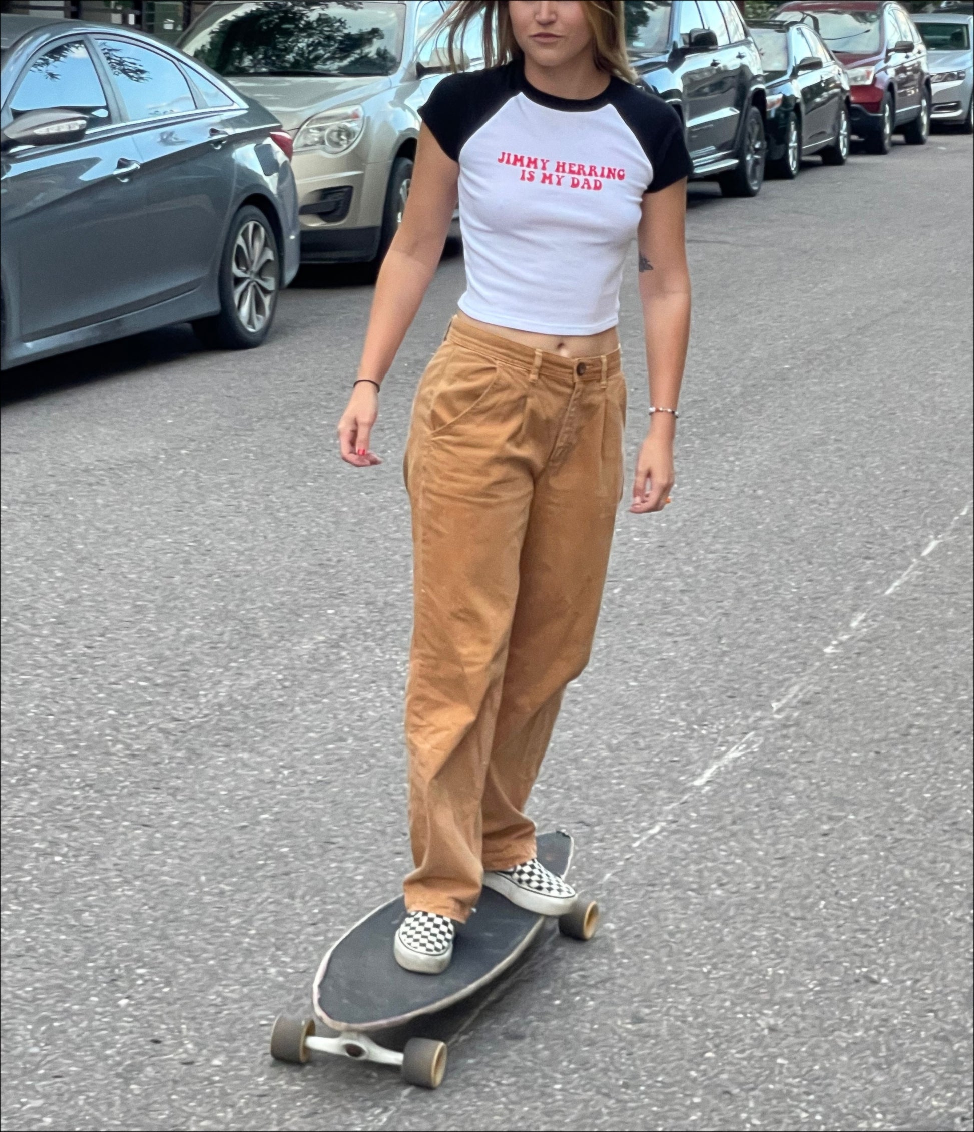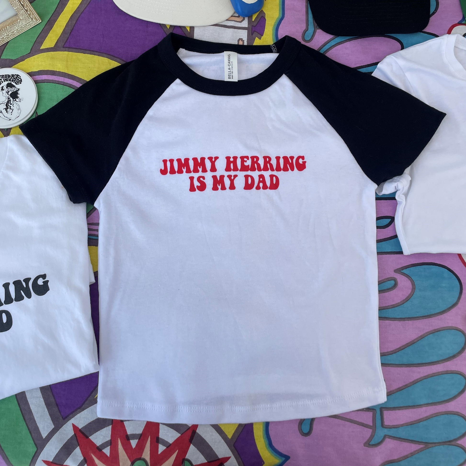 Jimmy Herring Is My Dad screen-printed in red on a black and white Bella+Canvas stretch fit baby tee. 52% cotton 48% polyester.